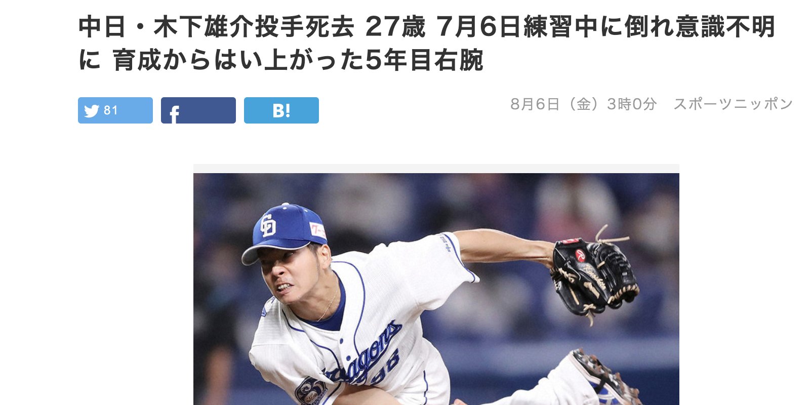 ワクチン接種後に死亡した中日ドラゴンズ木下投手の記事を何者かが検閲した形跡 報道管制か? 828293379 828293379 2021.08.07 0 コメント 0 コメントを書く お名前: url:. ホーム 中日ドラゴンズ 木下雄介の脱臼の全治と復帰はいつ?似た症状の選手や選手生命は? こんにちわ、ギックスです。 中日ドラゴンズの木下雄介投手が話題になっていますね。 オープン戦で登板したのですが、投球直後にうずくまってしまい、そのまま負傷退場となってしまいました。 1 風吹けば名無し 2021/07/29 (木) 00:54:16.04 id:eb83ttrra. 木下雄介 投手 の 悲しい訃報です #木下雄介 #中日ドラゴンズ #死亡 #訃報 #投手